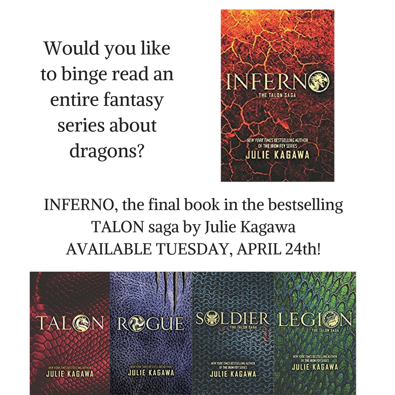 Inferno, the final book in the NYT bestselling Talon series by international bestselling author Julie Kagawa, is now available everywhere! If you’re a binge reader, this is your wheelhouse. Five amazing YA fantasy novels featuring dragons, martial arts, action, teenagers, shifters, and a whole lot of great writing. Check it out! https://www.amazon.com/s/ref=nb_sb_ss_c_1_18?url=search-alias%3Daps&field-keywords=julie+kagawa+talon+saga&sprefix=Julie+Kagawa+Talon%2Caps%2C1998&crid=4HFDOE0ENB3S