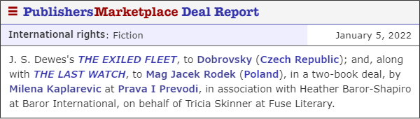 The new year brought two new foreign rights deals for THE LAST WATCH and THE EXILED FLEET, the first two books in The Divide series by J. S. Dewes.
