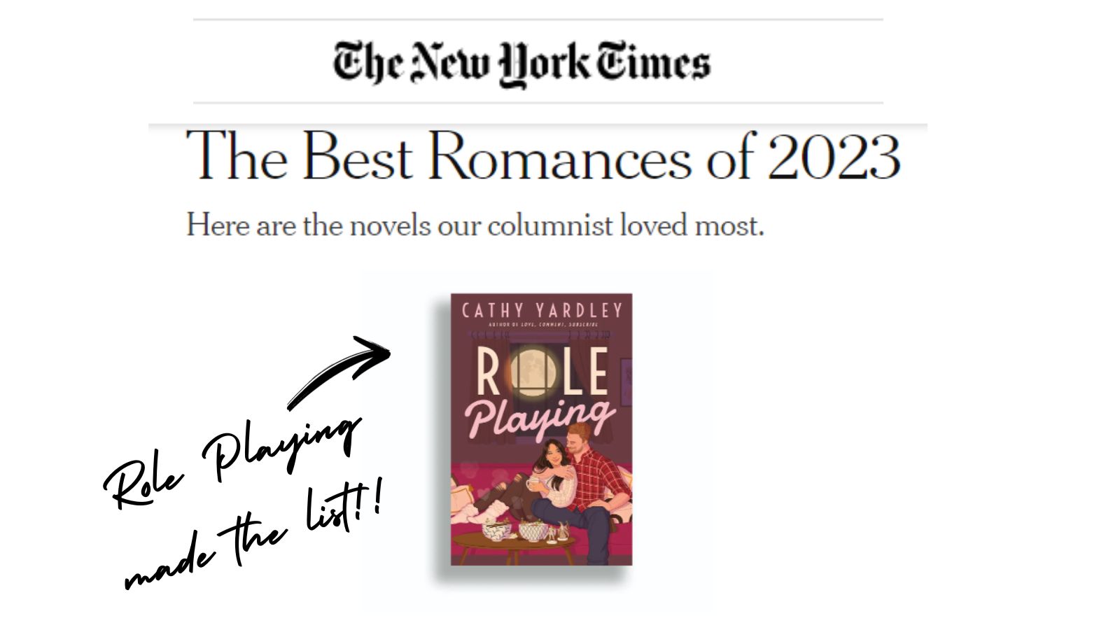 Thrilled to see Cathy Yardley’s mature couple romance, ROLE PLAYING, on the New York Times “Best Romances of 2023.”