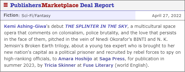Kemi Ashing-Giwa will make her publishing debut with The Splinter In The Sky. Saga Press expects to publish the book in Summer 2023.