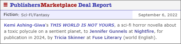 Congratulations to Kemi Ashing-Giwa! Her sci-fi horror novella, THIS WORLD IS NOT YOURS, will be published by Tor’s Nightfire imprint.